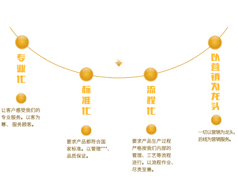 标准化——要求产品都符合国家标准。以管理品质保证。 流程化——要求产品生产过程严格按我们内部的管理、工艺等流程进行。以流程作业、尽责至善。 以营销为龙头——一切以营销为龙头,后线为营销服务。